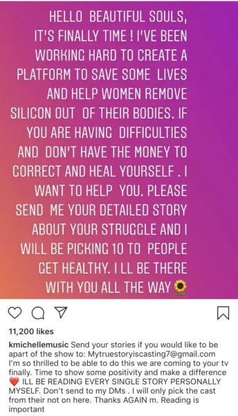 “I’ve been working hard to create a platform to save some lives and whelp women remove silicone out of their bodies. If ou are having difficulties and don’t have the money to correct and heal yourself, I want to help you. Please send me your detailed story about your struggle and I will be picking 10 people to get healthy. I’ll be there with you all the way.”