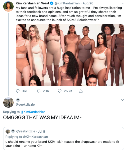 Kim Kardashian just revealed SKIMS as the new name for her shapewear line, and she’s already facing criticism for not giving a fan who came up with it the credit. She renamed the brand after she fought off backlash for the original name, Kimono, which many said was an appropriation of Japanese culture.