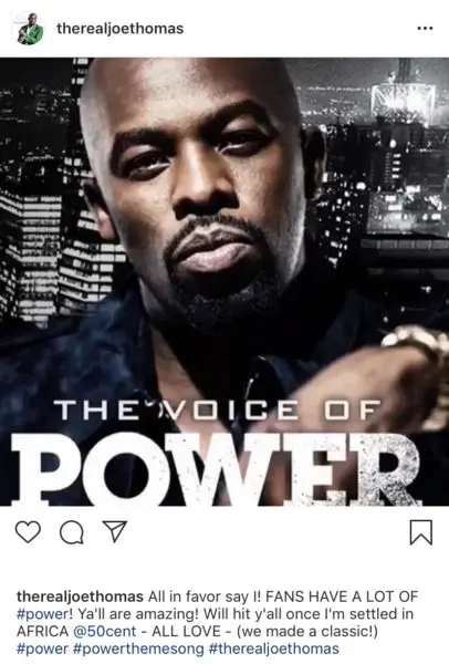 “All in favor say I! FANS HAVE A LOT OF #power! Ya’ll are amazing! Will hit y’all once I’m settled in AFRICA @50cent – ALL LOVE – (we made a classic!) #power#powerthemesong #therealjoethomas“