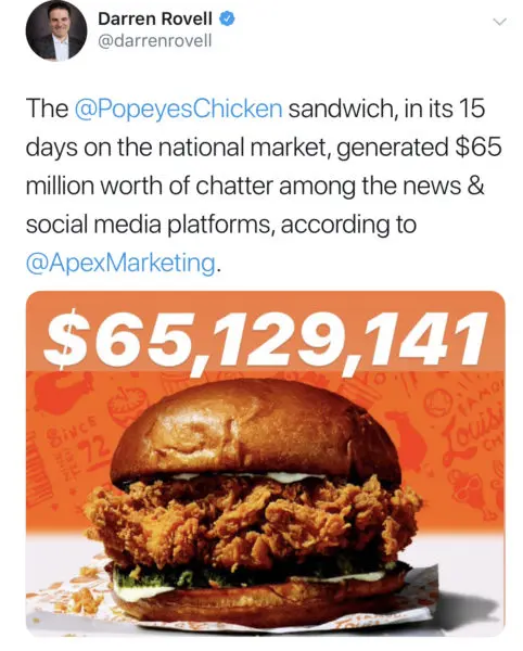 The craze began after a Twitter feud between Chick-fil-A and Popeyes inspired consumers to taste the new sandwich for themselves. As word of mouth continued to grow adding the underrated effects from social media, the fast food restaurant reportedly generated $65 million from multiple social media platforms, according to reports.