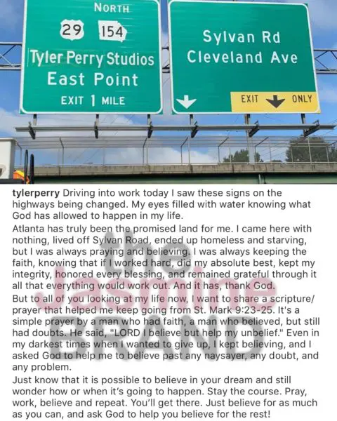 Director Tyler Perry shared his rags to riches story after revealing a huge accomplishment in the city of Atlanta where a newly updated highway sign added his famous Tyler Perry Studios just one mile away. The film mogul purchased the historic army base in 2016, and since, the studio has continued to grown into one of the largest motion picture studios in the U.S. This week, Perry reflected on moving to Atlanta with nothing while keeping his faith. He writes,