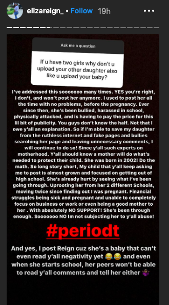 As for her older daughter, Eliza said she refuses to post her anymore. She said that the child suffered bullying at school once Eliza announced her pregnancy with Future’s youngest child.