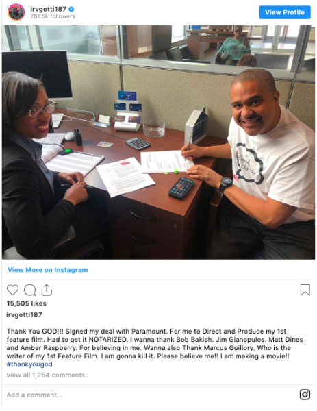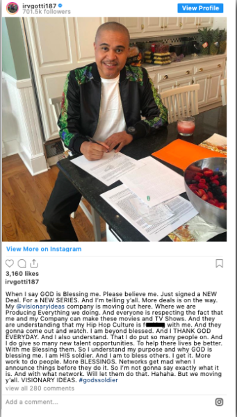“When I say GOD is Blessing me. Please believe me. Just signed a NEW Deal. For a NEW SERIES. And I’m telling y’all. More deals is on the way. My @visionaryideas company is moving out here. Where we are Producing Everything we doing. And everyone is respecting the fact that me and my Company can make these movies and TV Shows. They are understanding that my Hip Hop Culture is f***ing with me. And they gonna come out and watch. I am beyond blessed. And I THANK GOD EVERYDAY”