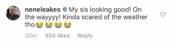 “@neneleakes My sis looking good! On the wayyyy! Kinda scared of the weather tho”