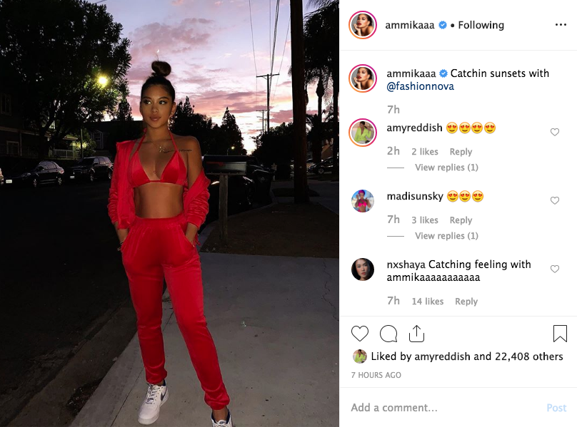 Earlier today (September 2nd), Ammika posted a fashion image, showing off her stomach. Wearing a red bikini, matching bottoms and jacket, she posed in front of a sunset. From the font angle, it doesn’t appear that her stomach is protruding.
