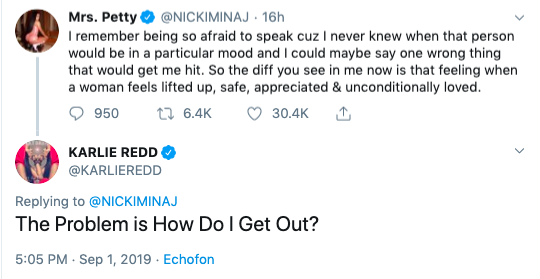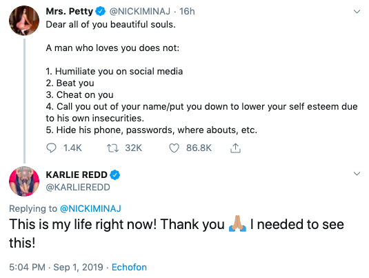 It looks like Karlie Redd may need some help getting out of an unhealthy relationship. She reached out to Nicki Minaj after the Megatron rapper gave her fans advice about being in toxic relationships, and even opened up about her own previous situation. See Nicki’s tweets below.