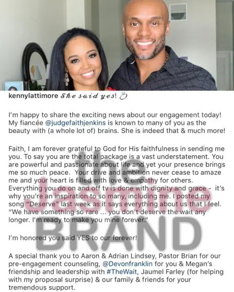 “I’m happy to share the exciting news about our engagement today! My fiancée Judge Faith Jenkins is known to many of you as the beauty with (a whole lot of) brains. She is indeed that & much more!?