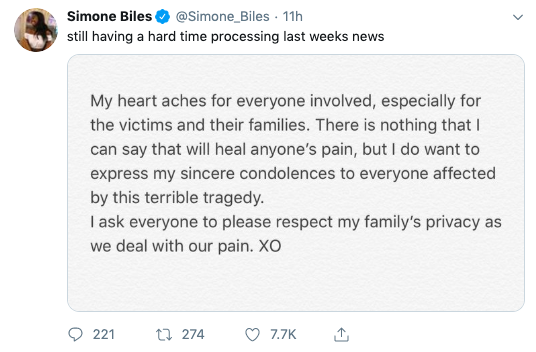 “My heart aches for everyone involved, especially for the victims and their families. There is nothing that I can say that will heal anyone’s pain, but I do want to express my sincere condolences to everyone affected by this terrible tragedy. I ask everyone to please respect my family’s privacy as we deal with our pain. XO”