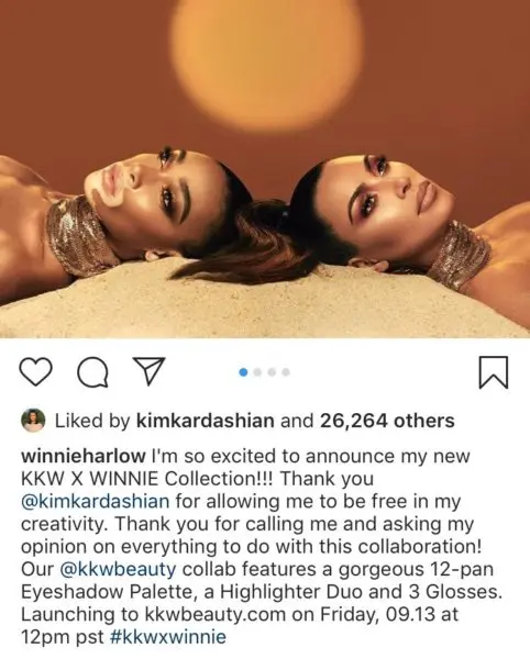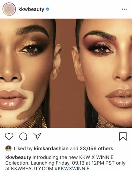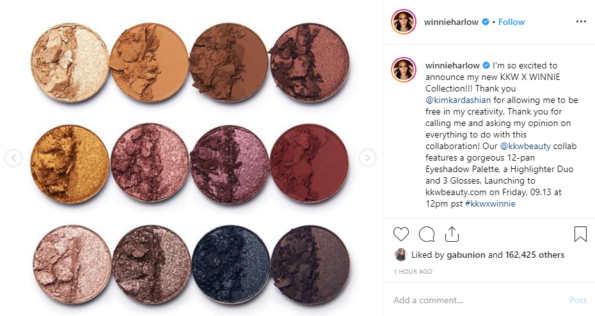 “@winnieharlow I’m so excited to announce my new KKW X WINNIE Collection!!! Thank you @kimkardashian for allowing me to be free in my creativity. Thank you for calling me and asking my opinion on everything to do with this collaboration! Our @kkwbeauty collab features a gorgeous 12-pan Eyeshadow Palette, a Highlighter Duo and 3 Glosses. Launching to kkwbeauty.com on Friday, 09.13 at 12pm pst #kkwxwinnie”