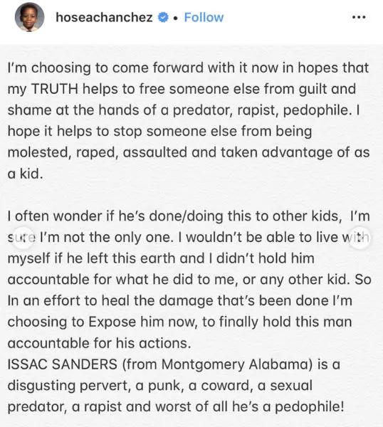 “In an effort to heal the damage that’s been done I’m choosing to expose him now, to finally hold this man accountable for his actions. ISAAC SANDERS (from Montgomery Alabama) is a disgusting pervert, a punk, a coward, a sexual predator, a rapist and worst of all he’s a pedophile!”
