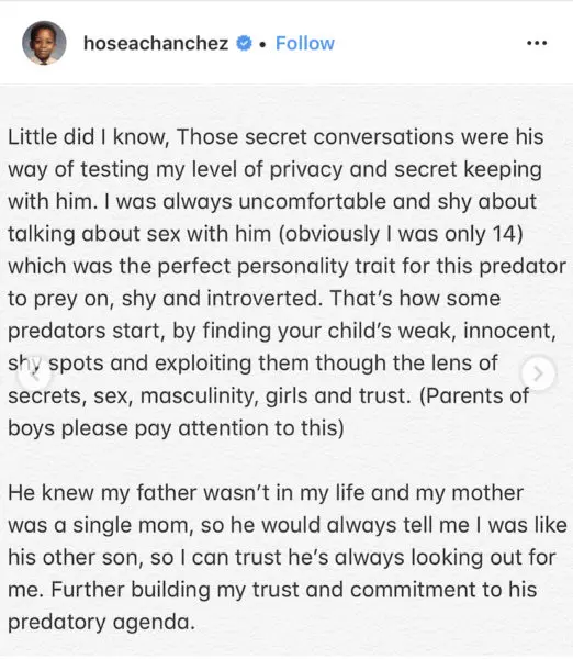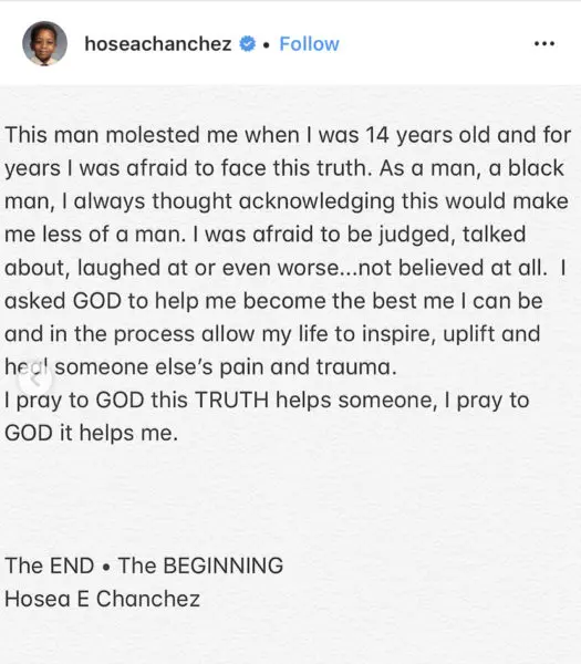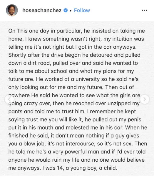 “I was 14, a young boy, a child. I’m choosing to come forward with it now in hopes that my TRUTH helps me to free someone else from guilt and shame at the hands of a predator, rapist, pedophile. I hope it helps to stop someone else from being molested, raped, assaulted and taken advantage of as a kid.”