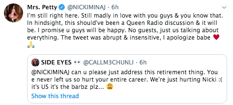 “I’m still right here. Still madly in love with you guys & you know that. In hindsight, this should’ve been a Queen Radio discussion & it will be. I promise u guys will be happy. No guests, just us talking about everything. The tweet was abrupt & insensitive, I apologize babe ???”