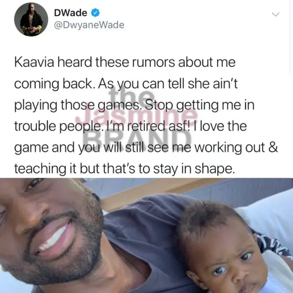 As Wade’s “never say never,” comment drew more attention online, the 3-time NBA champion jokingly says his 10-month-old daughter isn’t happy about any news of a return,
