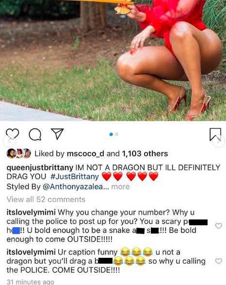 She said she previously gave Brittany, who also appeared in a recent season of Love & Hip Hop: Atlanta, a chance to be cool with her, despite others telling her that Brittany was shady. But now has found out that Brittany has been allegedly messing with her husband, and thinks she did nothing wrong. Lovely Mimi called for Instagram fans to step in and go for Brittany.