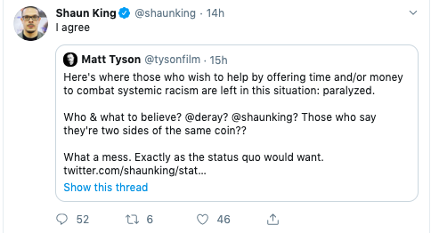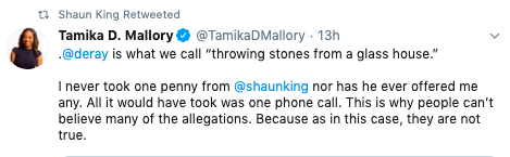 “Shaun has followed a uniform pattern over the years, a pattern that has compelled me to speak up, again. This is not the first time I have done so, and I am not alone. Johnetta Elzie and I were in a previous public disagreement with Shaun about issues of transparency and ethics that ended in his apology. Shaun also deleted all of his tweets and noted that he would focus on journalism and would not engage in attempted organizing or fundraising. Importantly, he made this commitment to others both publicly and privately. It is clear now that he did not keep those commitments and after a brief hiatus, re-emerged and began engaging in the same behaviors that caused the last public conflict.”
