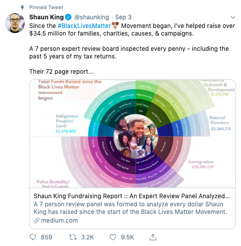 “He has previously made statements that he has raised millions since the movement began. In 2015, Shaun said that he’d raised $500,000 since the protests began. In 2017, he said he’d raised over $5 million since the same timeframe. Now, he is saying that he raised $34.5 million since 2014. How does he get to $34.5 as the number he raised?”