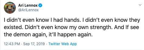 “I didn’t even know I had hands. I didn’t even know they existed. Didn’t even know my own strength. And If see the demon again, it’ll happen again.”