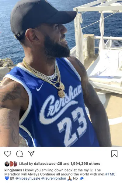 NBA superstar, LeBron James took to social media on Monday (Sept. 16th) wearing a rare blue alternate Los Angeles Lakers throwback jersey, paying his respects to late rapper Nipsey Hussle. In the photo, LeBron snapped a selfie while on vacation oceanside in his No. 23 Crenshaw jersey adding how he will continue Nipsey’s world famous motto,