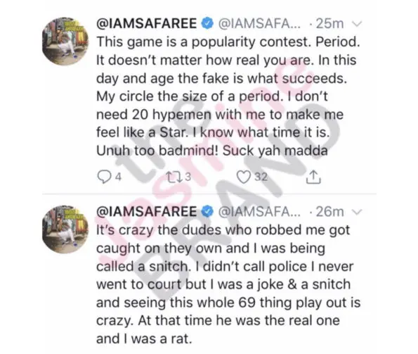 “This game is a popularity contest. Period. It doesn’t matter how real you are. In this day and age the fake is what succeeds. My circle the size of a period. I don’t need 20 hypemen with me to make me feel like a Star. I know what time it is. Unuh too badmind! Suck yah madda”