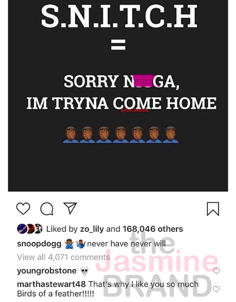 Snoop Dogg Say’s He’ll Never Be A Snitch & Martha Stewart Responds ‘Birds Of A Feather!’