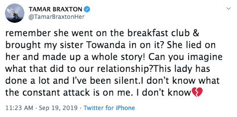She also points out that something was said by presumably by Loni, about her sister Towanda Braxton, during an interview on The Breakfast Club. See the clip below of Loni mentioning Towanda.