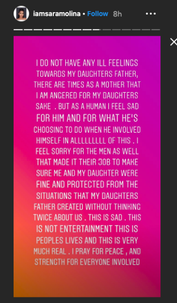 “I do not have any ill feelings towards my daughters father, there are times as a mother that I am angered for my daughters sake. But as a human I feel so sad for him and what he’s choosing to do when he involved himself in allllllll of this. I feel sorry for the men as well that made it their job to make sure me and my daughter were fine and protected from the situations that my daughters father created without thinking twice about us. This is sad. This is not entertainment this is peoples lives and this is very much real. I pray for peace, and strength for everyone involved.”