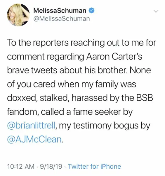 Last year, Melissa Schuman – member of Diddy‘s former girl group, Dream – came forward with claims that Nick raped her in 2002, which he denies. She’s also been publicly slammed by fans of Nick, and even his BSB group members, Brian Littrell and AJ McLean.