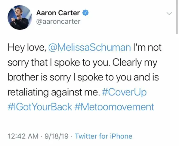 Aaron Carter attributes the restraining order to his involvement with Melissa, and has since dropped an explosive bomb – accusing their sister of sexually abusing him as a child. Aaron, also, revealed that Nick allegedly sexually abused another female member of their family, and was physically abusive to ex-girlfriend, Paris Hilton.