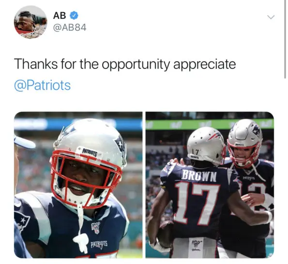 After New England announced his release, Brown who reportedly practiced with the Patriots earlier Friday (Sept. 20th), tweeted his thanks to the organization.