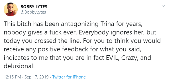 “This b*tch has been antagonizing Trina for years, nobody gives a f*ck ever. Everybody ignores her, but today you crossed the line. For you to think you would receive any positive feedback for what you said, indicates to me that you are in fact EVIL, Crazy, and delusional!”