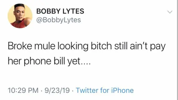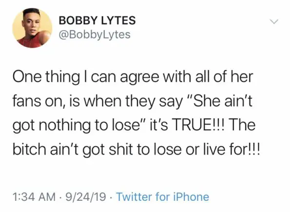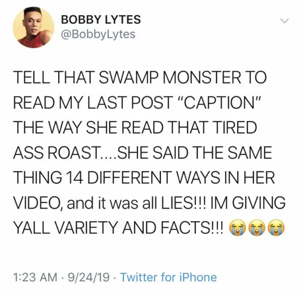 “@bobbylytes You made that video in this dungeon cabin. Im not one to make fun of the less fortunate, but sis you broke and miserable. You ain’t got no money, you don’t make any money off of the videos you make and you d*mn sure would be devasted if a b*tch got online and started blasting your daughter and son which you had at a very young age. Your recent n*gga was f*cking transsexuals behind your back and brought you back a gift that landed you in the clinic. Is that why you always have health jokes? You living in denial and your own insecurities are projecting upon others? You have been driving a medicare van around Atlanta, wrapped in old pictures from 2001 like it’s cute. Currently you have nothing going for yourself, I’m more poppin than you. I got more sh*t going on than you, and I d*mn sure make more money than you. You always want to drag somebody but truth be told that is all you are worth, you are a joke.”