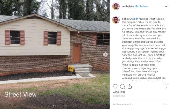 The caption Bobby Lytes referred to was his lengthy roast about Khia’s children and appearance with a screenshot of a Google maps surveillance photo of her alleged home: