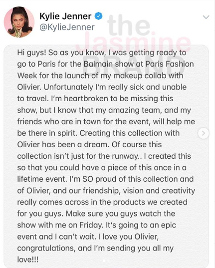 Update #1: #Kylie has released a statement confirming she’s sick. She also says she’s unable to travel and will miss Paris Fashion Week and her makeup collaboration w/ Olivier.