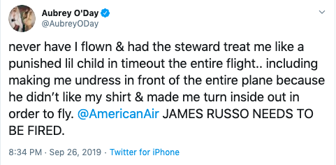 “never have I flown & had the steward treat me like a punished lil child in timeout the entire flight.. including making me undress in front of the entire plane because he didn’t like my shirt & made me turn inside out in order to fly @AmericanAir JAMES RUSSO NEEDS TO BE FIRED.”
