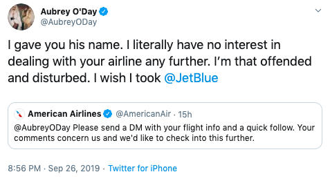 “I gave you his name. I literally have no interest in dealing with your airline any further. I’m that offended and disturbed. I wish I took@JetBlue”