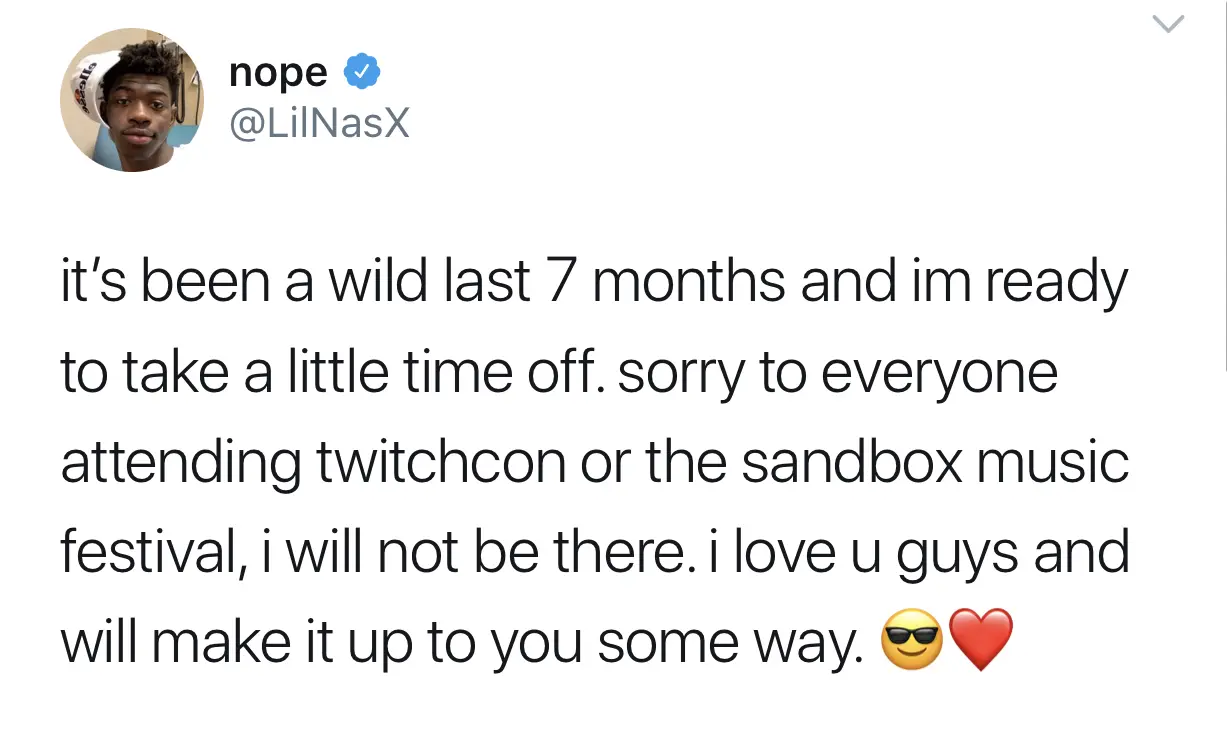 ‘it’s been a wild last 7 months and im ready to take a little time off. sorry to everyone attending twitchcon or the sandbox music festival, i will not be there. i love u guys and will make it up to you some way.’