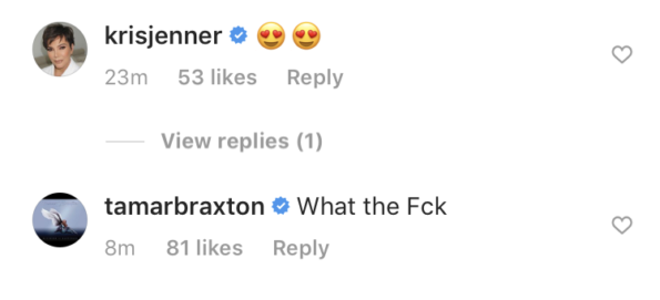Family friend Kris Jenner may be enjoying Toni Braxton’s sexy self-love journey, but baby sister Tamar Braxton left some choice words for the “Unbreak My Heart” singer in the comment section. Perhaps this is what prompted Toni to delete the photo. She said: