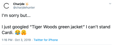 The green jacket Cardi was referring to is when Woods won the golf masters back in April, after a 14-year drought. The win marked the fifth masters title for Woods.