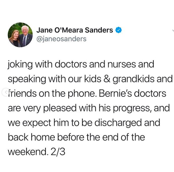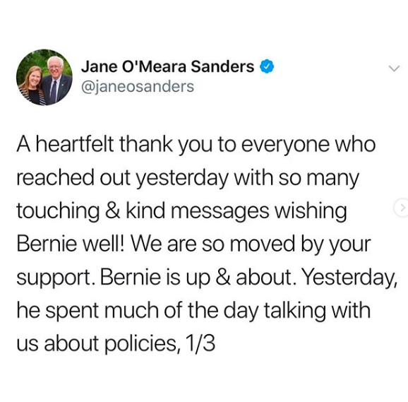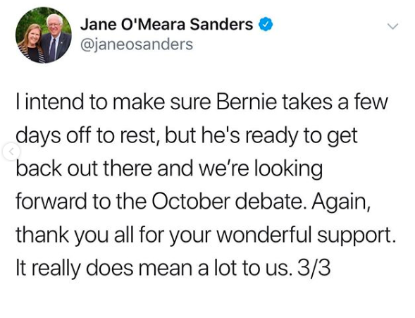 His wife, Jane O’Meara Sanders also gave an update.