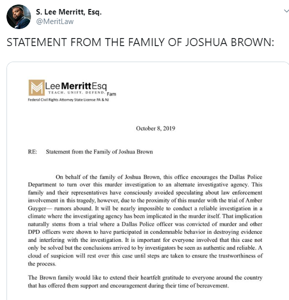 In Joshua Brown’s case, Merritt doesn’t believe that Dallas Police weren’t involved in his murder. He told USA Today:
