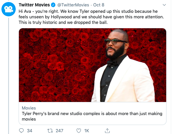 Ava DuVernay has jumped to Tyler Perry’s defense after Twitter failed to include the opening of Tyler Perry Studios in its @TwitterMoments.