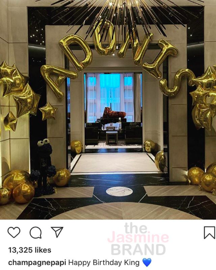 Drake also celebrated with balloons that spelled their son’s name and wrote