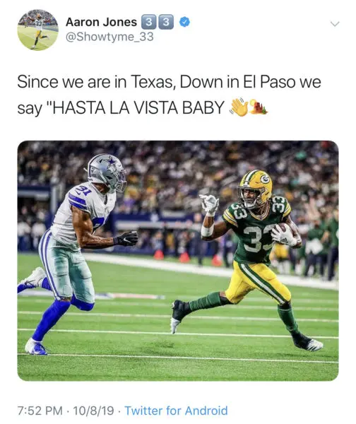 Green Bay Packers star, Aaron Jones, 24, was fined by the NFL for waving goodbye to Dallas Cowboys cornerback Byron Jones during his run into the end zone last Sunday (Oct 6th). The subtle gesture in their 34-24 win over the Cowboys will cost the Packers cornerback more than $10,000. Jones, who added an extra layer onto his 6-yard carry, took to Twitter to celebrate. He writes,