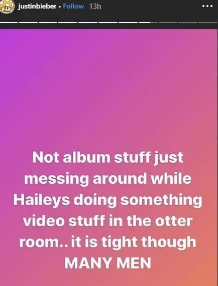 Bieber later followed up the video with a message on Instagram revealing the song is not for his long-rumored album but just some entertainment while in the studio. He writes,