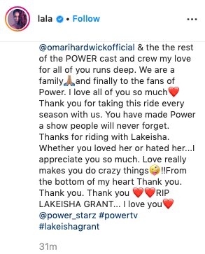 “@omarihardwickofficial & the the rest of the POWER cast and crew my love for all of you runs deep. We are a family and finally to the fans of Power. I love all of you so much Thank you for taking this ride every season with us. You have made Power a show people will never forget. Thanks for riding with Lakeisha. Whether you loved her or hated her…I appreciate you so much. Love really makes you do crazy things From the bottom of my heart Thank you. Thank you. Thank you RIP LAKEISHA GRANT… I love you @power_starz #powertv #lakeishagrant“