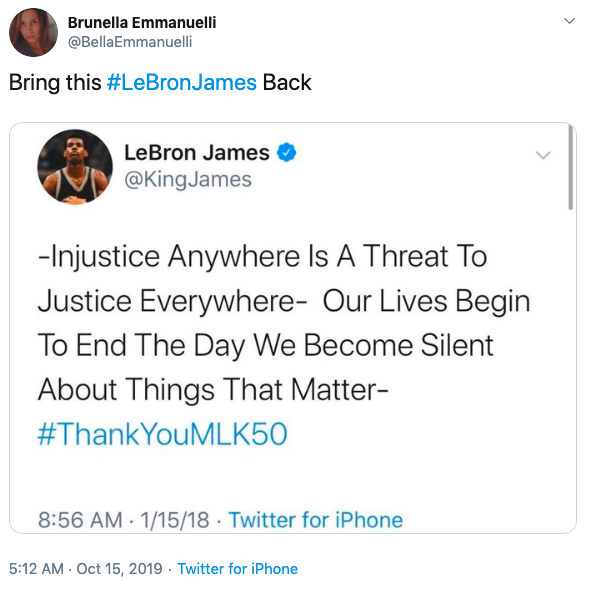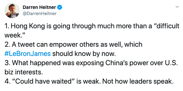 He then hopped on Twitter and said that Morey could have pressed pause on sending the tweet, considering the Houston Rockets and the Toronto Raptors were competing in preseason games in Japan at the time.