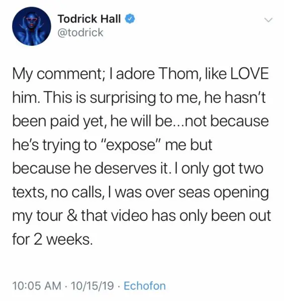 “A bunch of folks have asked about my experience working with Todrick… & I know it’s no surprise but just gonna tell u all now… yes… Your reservations about the fella are valid. Which is sad bc, he is talented indeed, but that talent is squandered by coonery. Baby is whitewashed to hell. And miserably unprofessional. **also does not pay!**…The 1st one (Nails, Hair Hips Heels) was unpaid because he needed over 60+ dancers & says he didn’t have the budget to pay us (then don’t use dancers, tf!)”