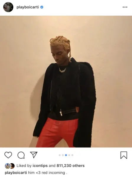 Rapper Playboi Carti has posted very subliminal messages this week, sharing subtle hints of a possible second album reportedly titled Whole Lotta Red. The 23-year-old rapper (real name Jordan Carter), first posted on Tuesday (Oct. 15), sharing a series of photos on Instagram dressed in a black fur top, red pants which highlights his signature dirty, sporting blond dreadlocks. He suggested the wait may soon be over as he writes,