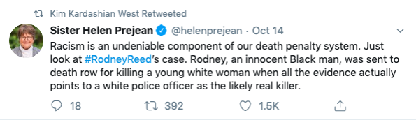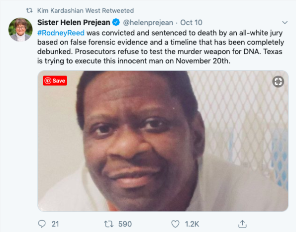 She went on to retweet the details of his case, including the notion that he had an all-white jury, that forensic evidence was false, and that prosecutors didn’t want to test the murder weapon for DNA.