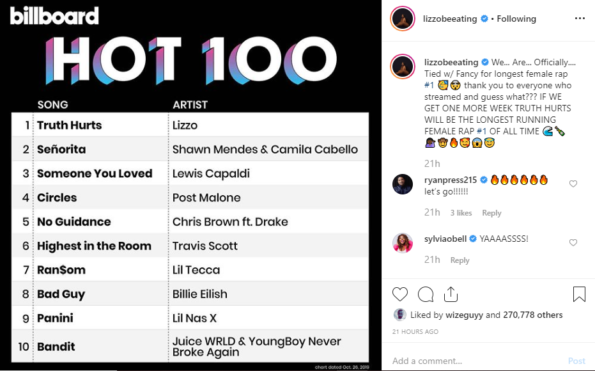 “Truth Hurts” first hit number one in September, sitting at the top for six consecutive weeks before being dethroned by Travis Scott‘s comeback single, “Highest in the Room.” But Lizzo returned to the top this week, marking a seventh week as queen of the Hot 100. She only ties with Iggy Azalea‘s single, “Fancy,” for longest-running rap song by a female artist.